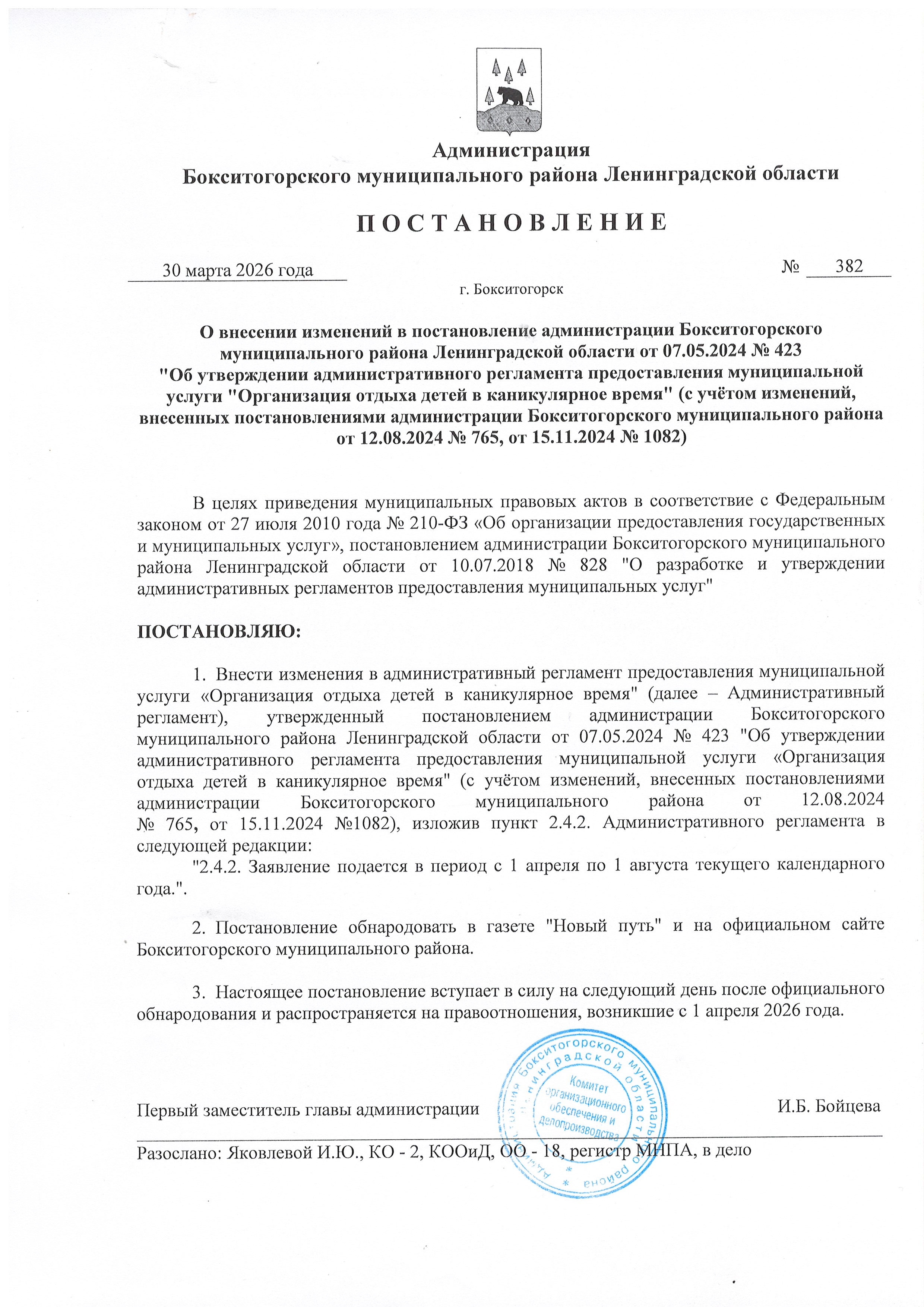 О внесении изменений в постановление администрации Бокситогорского муниципального района Ленинградской области от 07.05.2024 № 423 "Об утверждении административного регламента предоставления муниципальной услуги "Организация отдыха детей в каникулярное время" (с учетом изменений, внесенных постановлениями администрации Бокситогорского муниципального района от 12.08.2024 № 765, от 15.11.2024 № 1082)